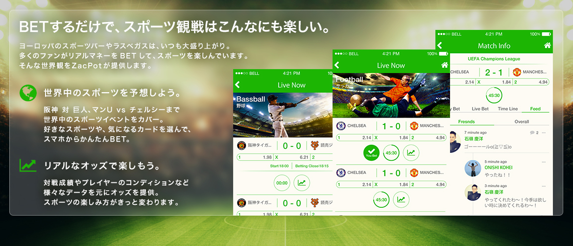 スポーツは世界中を魅了し続ける、最高のエンターテインメントです。 そんなスポーツをより楽しむためのプラットフォーム。それがZacPotです。 さぁ、今すぐ熱狂を手にしましょう。